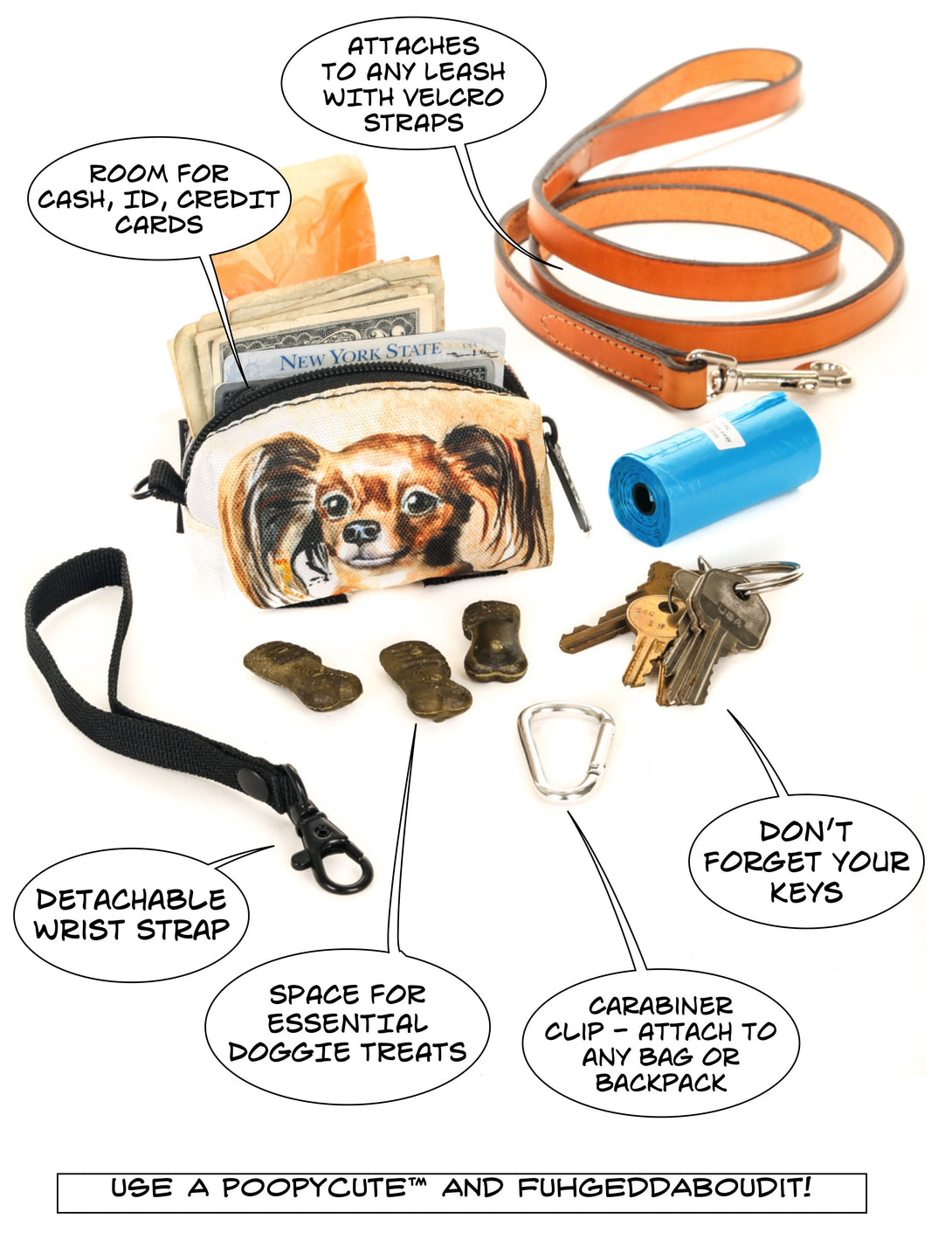 1. Detachable Wrist Strap Hang it by the door with the leash/harness and just grab and GO on your way out the door. The wrist strap will keep you from dropping poopyCUTE when SPOT makes a dash for the nearest hydrant. The wrist strap also allows you to carry the important goodies inside securely in your palm hand.