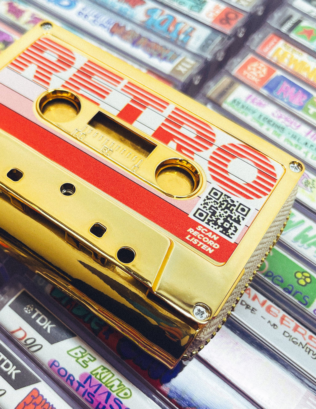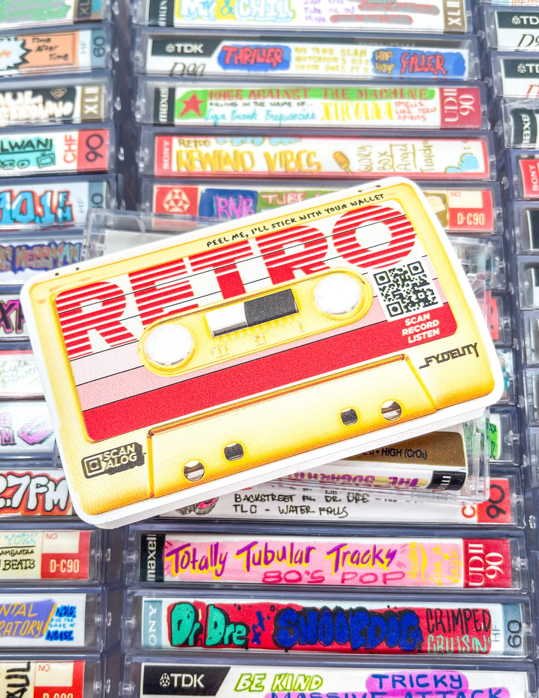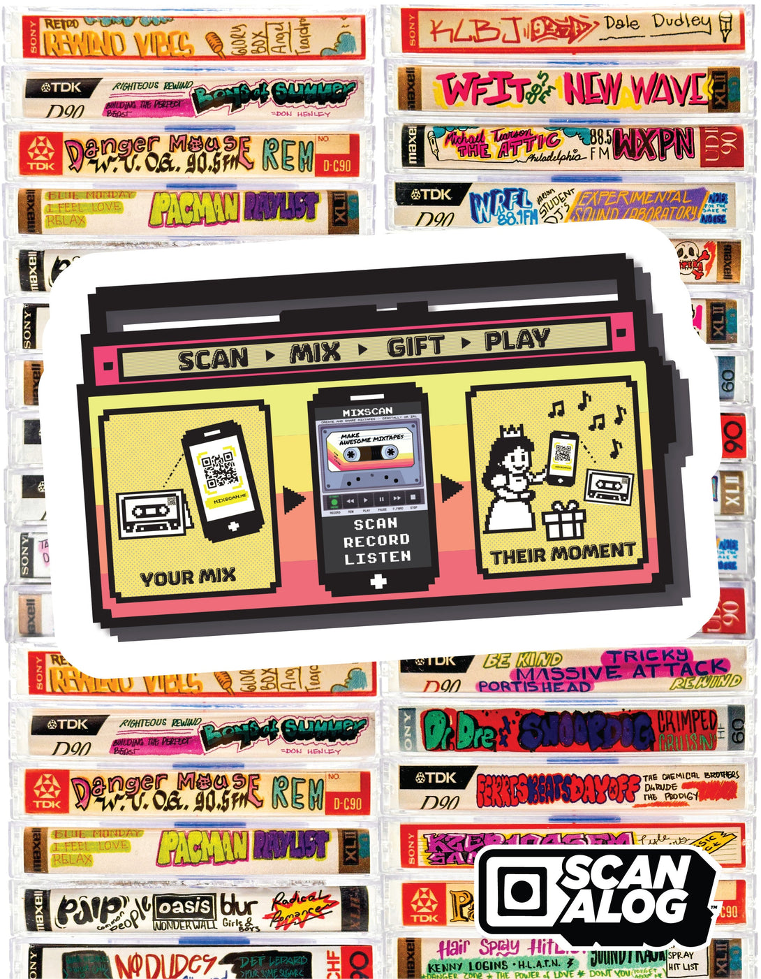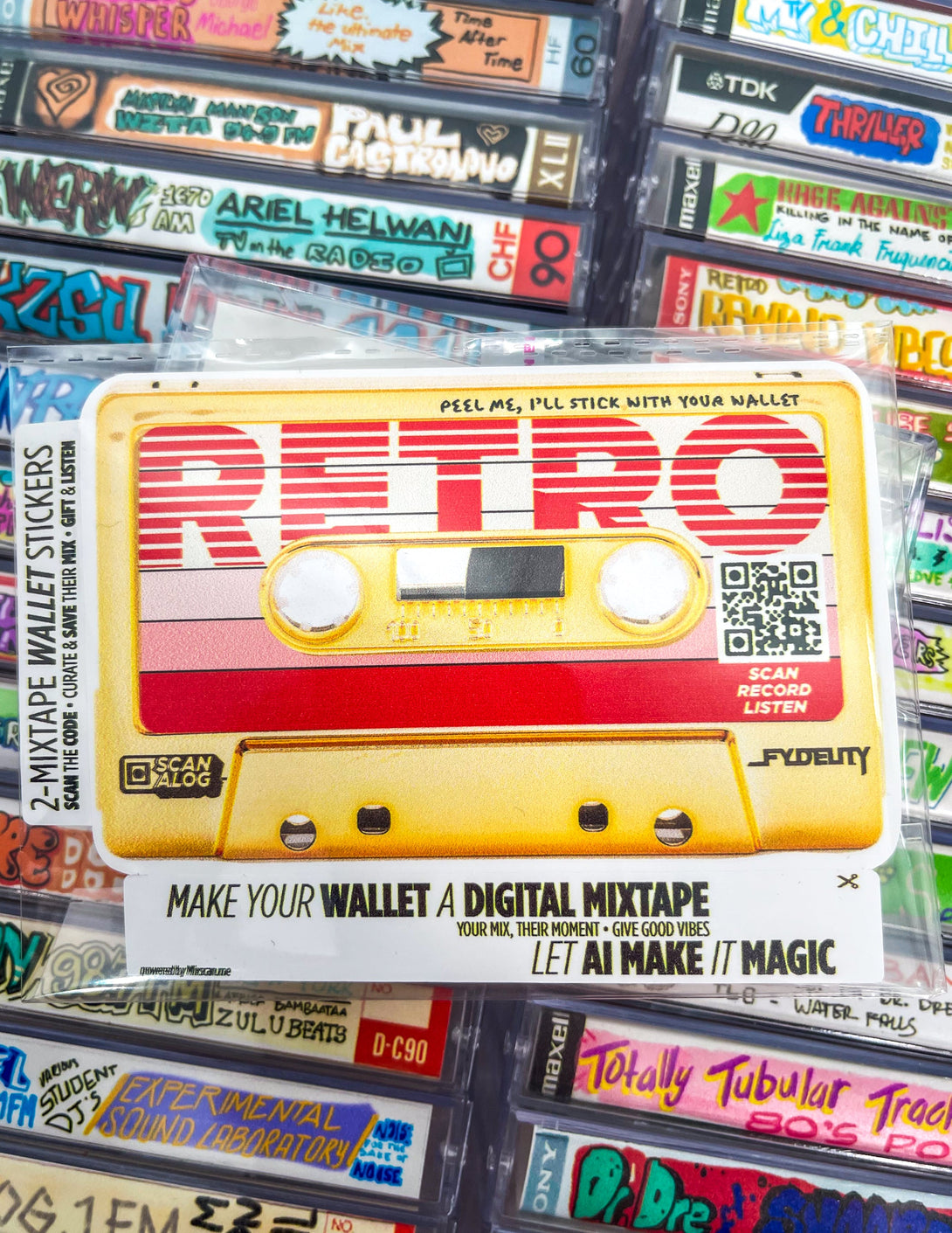 Turn a Fydelity cassette wallet into a reel Digital Mixtape experience. It’s easy. Add the Scanalog stickers, scan the QR code, build their 8-track mix, and craft a portable personal soundtrack that gives good vibes.