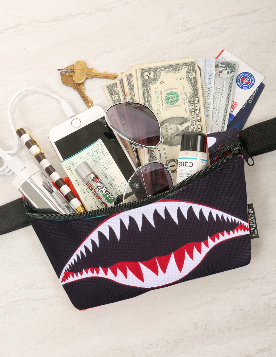 Wear the FYDELITY fanny pack to work, for an evening out, to music festivals, dance parties, raves, disco' s, night clubs, walking your dog, the beach, the pool, on spring break, tailgating, sleep away camp and to the gym. Makes a great gift for travelers. FYDELITY uses the best possible materials & construction techniques. FYDELITY Fanny Packs are the solution for big phones and tight jeans. Designed in Brooklyn, CA Fydelity, The Party' s in the Bag!