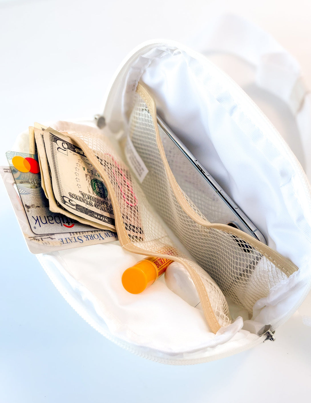 Main compartment with double zippers and two side mesh organizers—perfect for your communicator (phone), cosmic lip balm, and star-charged earbuds.