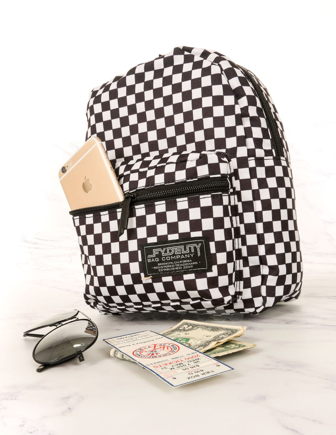 FASHION FRESH- Our fashion forward designs will accessorize any outfit. Choose from a range of funky 80' s / checkerboard / funky prints, metallic foils, holographic iridescent fabrics or stadium friendly clear designs. Fydelity's Mini Hipster Fashionista Backpack sleek lines won' t distract from your style and they can be discreetly worn day or night. Designed in Brooklyn, CA Fydelity, The Party' s in the Bag!